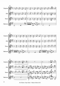 Besetzung: Sopran- (alternativ Alt-), Alt-, Tenor- und Baritonsaxophon, Partitur und Einzelstimmen mit Kopiererlaubnis, 24 Seiten. Schwierigkeitsgrad: gehoben. Musik des bekannten Komponisten und Saxophonisten Rainer Fabich.